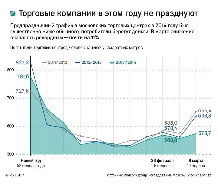 Несмотря на то что россияне любят баловать себя перед праздниками, негативный тренд был уже ощутим перед празднованием Нового года. По данным исследования Shopping index (проводит Watcom), в последнюю неделю 2013 года трафик в торговых центрах был ниже на 6%, чем в то же время годом ранее. Ниже был год к году трафик и перед 23 февраля. Вероятно, часть москвичек была разочарована подарками на 8 Марта: в этом году мужчин, посетивших торговые центры, было меньше — трафик за неделю перед 8 Марта был ниже почти на 11% (см. инфографику).