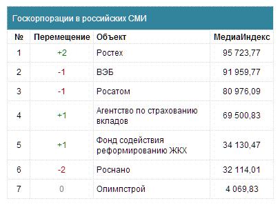 Первый медиарейтинг российских госкорпораций построен на основе данных мониторинга свыше 16 тыс. источников: ТВ, радио, газет, журналов, интернет-СМИ, информационных агентств. В 2013 году самыми упоминаемыми в СМИ госкорпорациями стали Ростех, ВЭБ и Росатом.