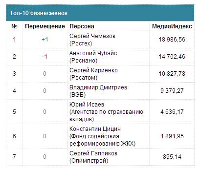 Лидерами медиарейтинга первых лиц госкорпораций в 2013 году стали Сергей Чемезов (Ростех), Анатолий Чубайс (Роснано) и Сергей Кириенко (Росатом).