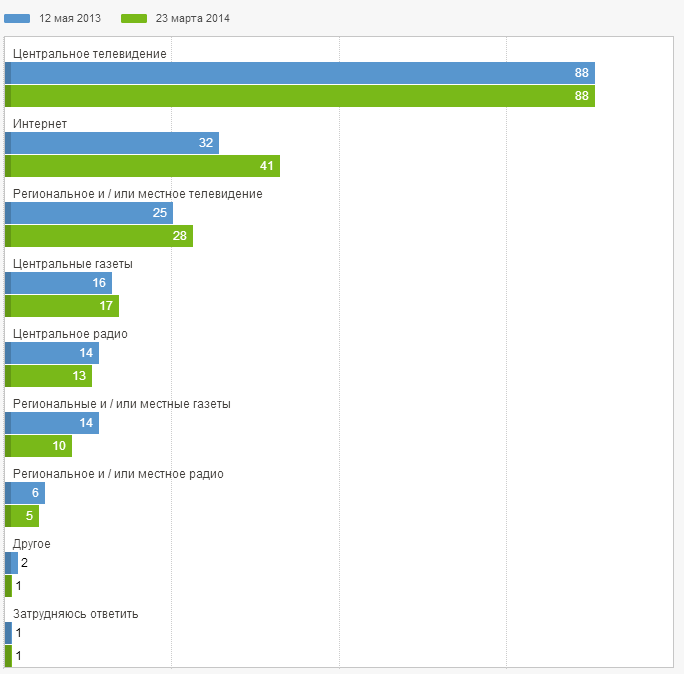 Опрос, проведенный 23 марта, показал, что последние новости подавляющее большинство россиян узнают благодаря центральному телевидению (88%). Остальные пользуются для этих целей Интернетом (41%), местным телевидением (28%), центральными газетами (17%), центральным радио (13%), местными газетами (10%) или радио (5%).