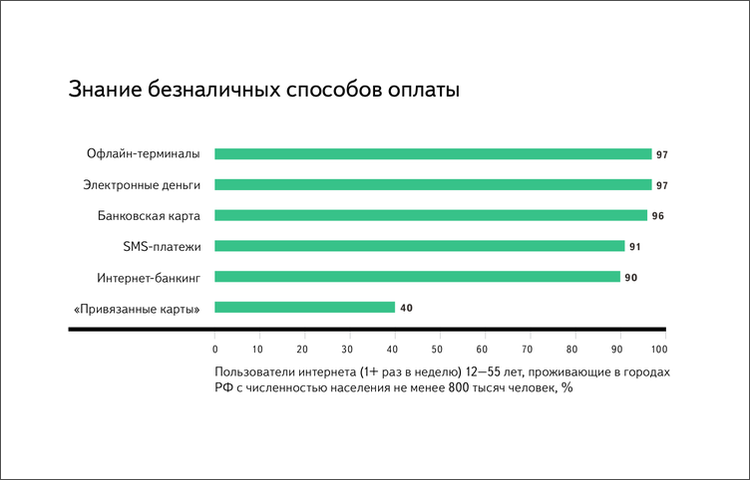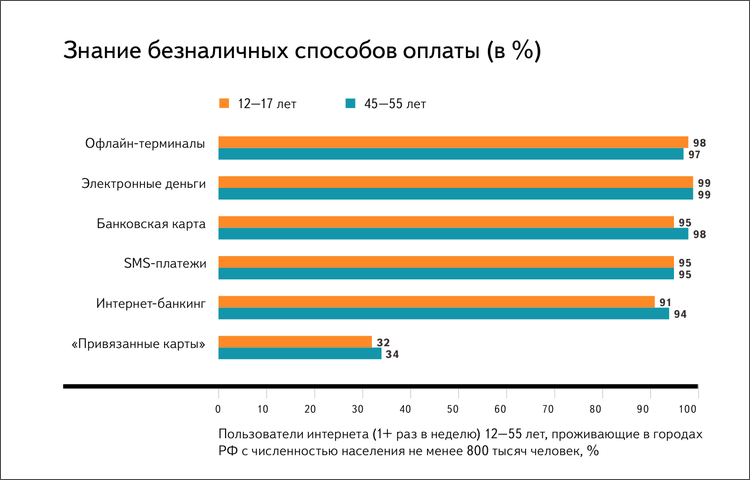 Электронные деньги — в тройке самых популярных безналичных способов оплаты у аудитории 12–55 лет. Про них знают 97% опрошенных, платили хотя бы раз за последние полгода – 46%. Таким образом, электронные деньги популярнее интернет-банкинга и SMS-платежей – ими пользуются 31% и 37% интернет-пользователей соответственно.