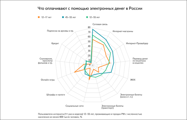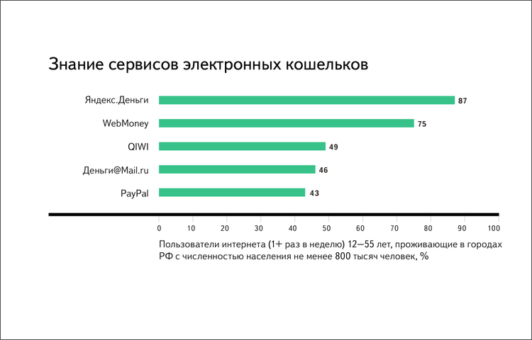 Самый известный и часто используемый сервис электронных денег в России — по-прежнему Яндекс.Деньги. Среди жителей крупных городов в возрасте от 12 до 55 лет 22% хотя бы раз за последние полгода платили через Яндекс.Деньги. Через QIWI.Кошелек – 21%, WebMoney – 19%, PayPal — 14%, Деньги Mail.ru — 6%. У подростков популярнее Яндекс.Деньги и Qiwi – их используют 27% молодежи, в то время как WebMoney и PayPal привлекают только 24% и 14% таких пользователей соответственно. Пользователи от 46 до 55 выбирают WebMoney и Яндекс.Деньги – 46% и 40% соответственно. Через Qiwi и PayPal в этой группе платит в 2 раза меньше пользователей (29% и 27% соответственно).