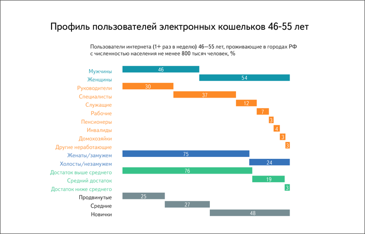 Мужчины и женщины используют электронные деньги одинаково часто. Большинство пользователей — руководители или специалисты, хорошо обеспечены или среднего достатка. Большая часть из них — продвинутые пользователи интернета (40%), но доля тех, кто только недавно освоил сеть, тоже велика (35%).