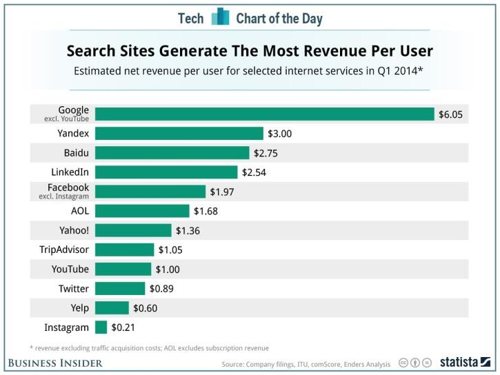 Согласно данным исследования, Google зарабатывает $6,05 на каждом своем пользователе.