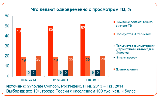 По данным исследования РосИндекс компании Synovate Comcon, все больше россиян не обращают внимания на другие медиа во время просмотра телевизора - в I кв. 52% респондентов сказали, что во время просмотра ТВ ничего не делают, просто смотрят телевизор. Пятая часть респондентов на фоне ТВ занимаются другими делами