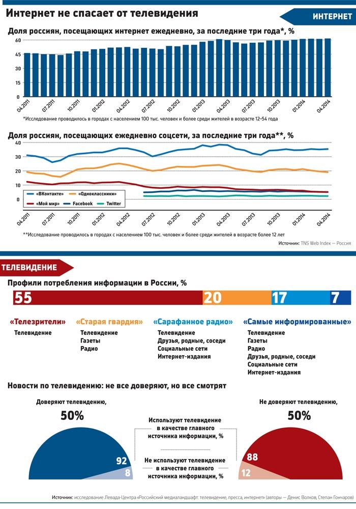 Россияне получают информацию о событиях в стране и мире из телевизора и предпочитают узнавать новости от госканалов или от друзей, а не из интернета: только треть российских пользователей Сети читает новостные интернет-издания. При этом новости федеральных каналов смотрит все большее число граждан страны, а доверие к ним с начала кризиса на Украине только выросло. Безальтернативность СМИ в России — важное условие поддержания действующего политического режима, считают авторы исследования Левада-Центра
