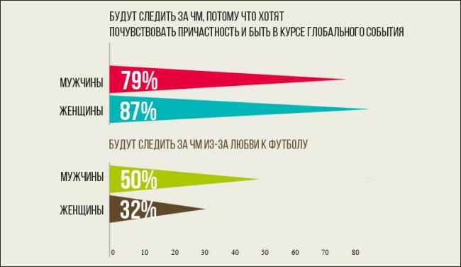 Для брендов в высшей степени важно, что чемпионат мира привлекает в том числе и тех, кто не испытывает большого энтузиазма в отношении футбольных соревнований в своих странах. Особенно это касается женщин: 87% из них отметили, что будут следить за ЧМ в основном потому, что хотят почувствовать причастность и быть в курсе глобального международного события (79% мужчин назвали эту же причину). Однако мужчины чаще женщин отвечали, что будут следить за событием из-за любви к футболу – 50% против 32%.