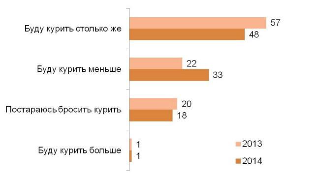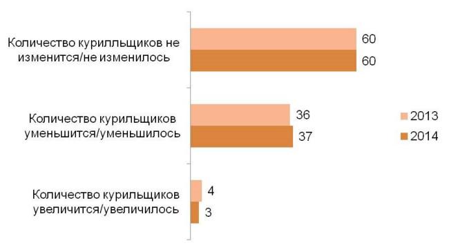 В начале июня исследовательский холдинг Ромир провел опрос жителей российских городов на предмет курения в связи со вступлением в силу 1 июня 2014 года новых запретов и ограничений на курение и продажу табачной продукции. Почти половина опрошенных считают, что постепенно число курильщиков должно сократиться
