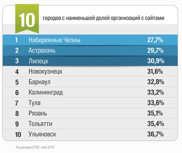 Хуже всего в интернете представлены организации из Набережных Челнов. В этом городе свои сайты есть только у 27,7 процента компаний. В первую десятку «антирейтинга» также вошли Астрахань, Липецк, Новокузнецк, Барнаул, Калининград, Тула, Рязань, Тольятти и Ульяновск.