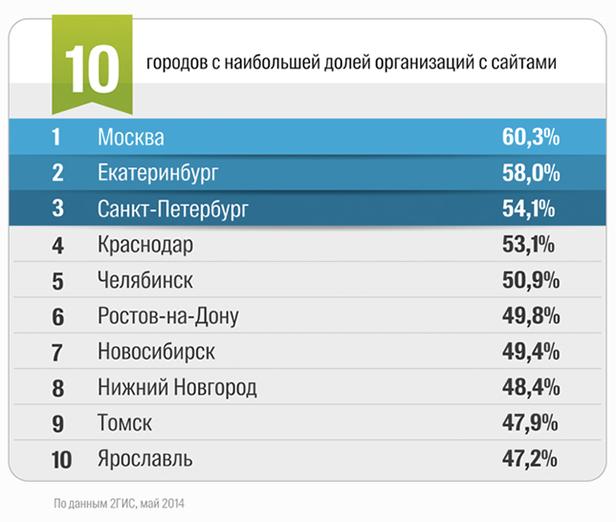 Аналитики проекта рассмотрели 1,4 миллиона фирм в 38 городах с населением более полумиллиона человек. На основе этого они составили рейтинг городов по доле компаний с сайтами.
