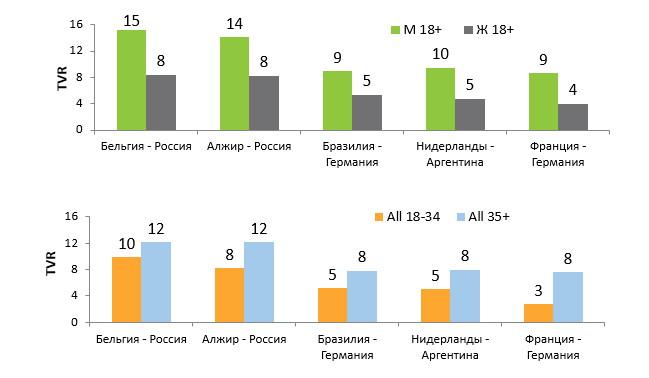 Большей популярностью матчи мирового футбольного первенства пользуются у мужчин старшего возраста. Самый высокий рейтинг среди мужчин – у игры Нидерланды-Аргентина, за исключением матчей с участием сборной России.