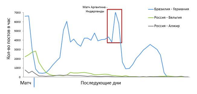 Исследование показало, что матч Германия-Бразилия стал самым обсуждаемым в соцсетях (преимущественно в Twitter и «ВКонтакте»), особенно во время первого тайма.