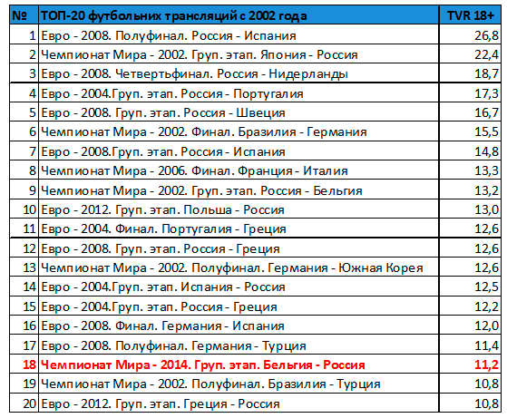 Так, один из трех матчей с участием сборной России вошел в ТОП-20 футбольных трансляций за всю историю, а именно – матч Россия-Бельгия. Его посмотрели 6 млн 985 тыс. россиян.