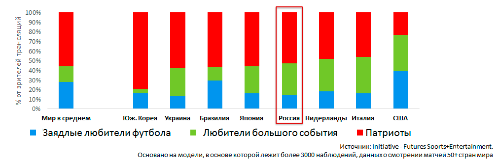 Согласно исследованию Initiative Futures Sports+Entertainment, можно выделить три сегмента зрителей чемпионата: патриоты, которые смотрят только матчи с участием своей национальной сборной, любители большого события, начинающие смотреть чемпионат мира только со стадии плей-офф, и заядлые любители футбола – для них характерно смотреть любые матчи. При этом в России доля патриотов находится на уровне среднего значения по миру. Именно за счет этой категории рейтинг телесмотрения матчей с участием сборной России увеличивается в три раза, так как патриоты составляют более половины от всех футбольных болельщиков. Наибольшее число патриотов, предпочитающих смотреть матчи исключительно своей сборной, — в Южной Корее. Первенство по количеству заядлых футбольных болельщиков, которые смотрят все матчи подряд, — у США и Бразилии.