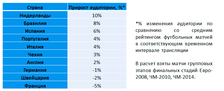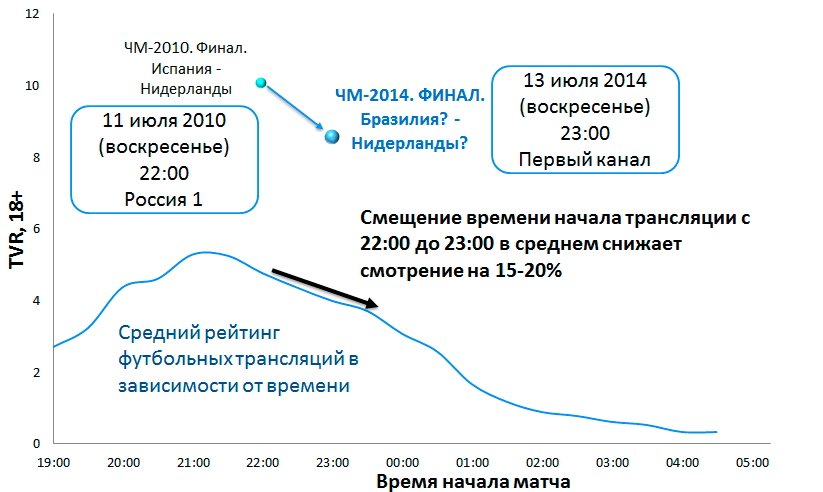 По оценке Initiative, на рейтинг телесмотрения прежде всего влияют такие факторы, как участие национальной сборной, близость к финалу и время трансляции. «Зрители ждут и смотрят чемпионат даже, если матчи проходят далеко за полночь, как это было в этом году. И чем ближе к финалу, тем выше рейтинг матча, – отмечает Анна Яковлева, генеральный директор Initiative. – Однако время показа является одним из ключевых критериев, влияющих на рейтинг телесмотрения. Чем позднее трансляция, тем ниже TVR. Таким образом, если показ переносится с 22.00 на 23.00, то телесмотрение в среднем снижается на 15%».