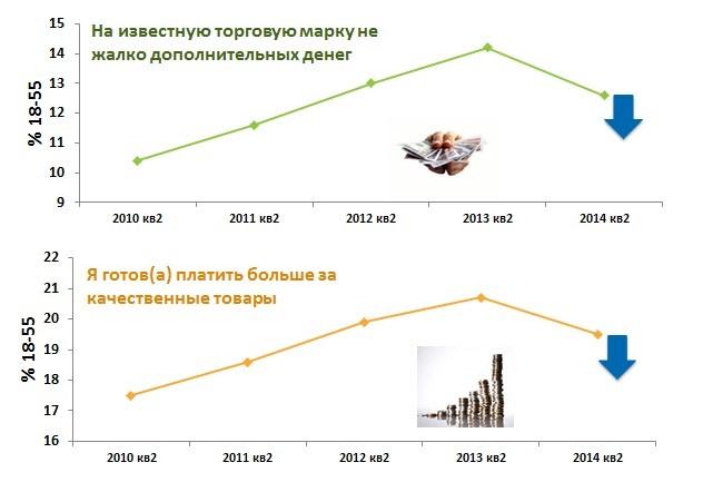 Кроме того, российские потребители в меньшей мере стремятся переплачивать за бренд и более качественные товары. По сравнению с прошлым периодом на 11% снизилось число россиян, готовых тратить дополнительные средства на известную торговую марку.