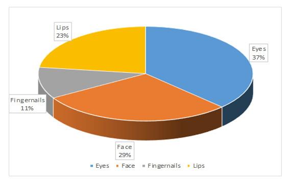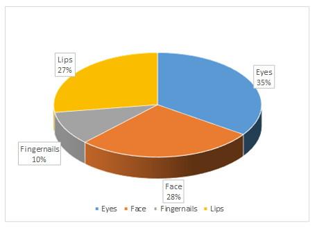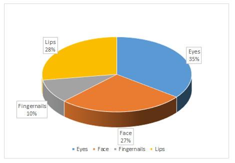 Лидирующие позиции по количеству публикаций в СМИ занимает категория Eyes с 37% от общего объема и 3 386 публикациями. Далее с небольшим отрывом идут средства макияжа для кожи лица — 2 619 публикаций и 29%. Косметика для губ охватывает 23% (2 068 публикаций), в то время как средства ухода за ногтями довольствуются скромной долей в 11% (970 упоминаний). Общее количество публикаций о средствах макияжа за первую половину 2014 года достигло 9 043.