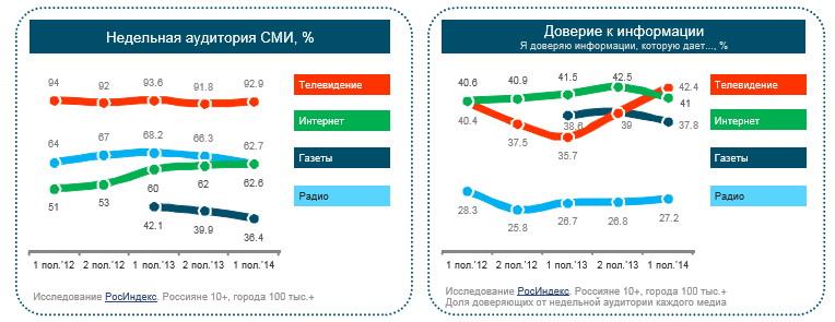 Данные регулярного исследования РосИндекс показывают активный рост доверия к телевидению, начавшийся во второй половине 2013 года, а прежде растущий тренд доверия к информации в Сети, напротив, демонстрирует снижение