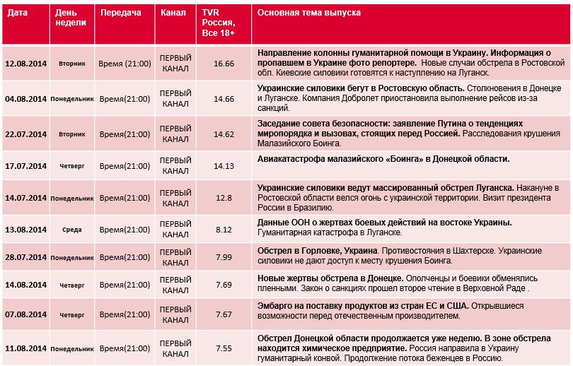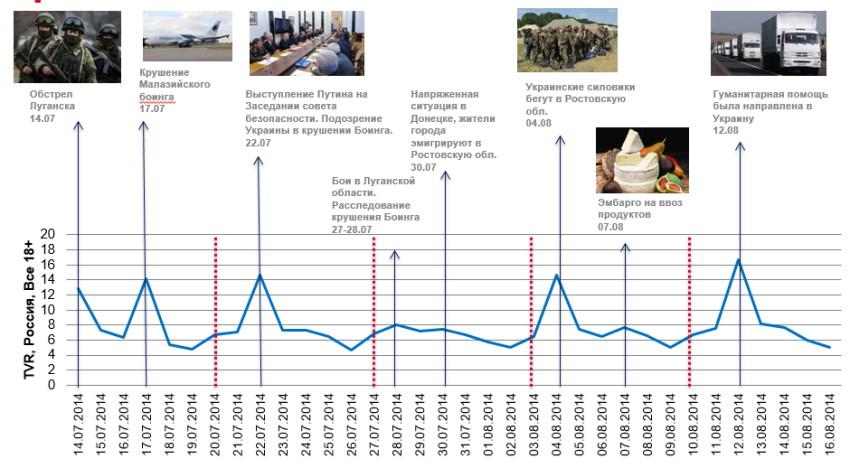 С середины июля 2014 года по настоящий момент случилось немало громких событий. В период с 14 по 17 июля произошли вооруженные столкновения в Луганске, авария в столичном метро и крушение «Боинга» в Донецке. Наибольший интерес аудитории вызвало последнее – 14.3 TVR.