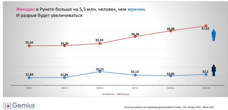 Согласно данным исследования, женщин в Рунете больше на 5,5 млн, нежели мужчин (37,5 млн и 32,2 млн соответственно). По данным Gemius, гендерный разрыв будет только увеличиваться.