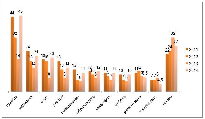 Исследовательский холдинг Ромир поинтересовался у россиян, какие крупные расходы были совершены в их семьях за последние полгода и что они планируют приобрести в следующие шесть месяцев. Аналогичные вопросы задавались в 2013, 2012 и 2011 годах