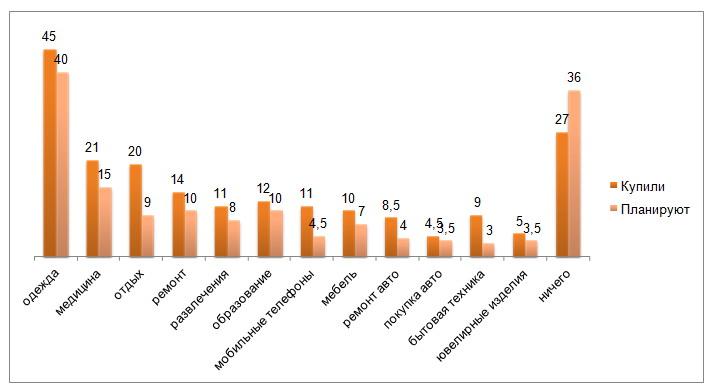 Согласно исследованию, 27% респондентов заявили, что в прошедшие полгода их семьи не совершили ни одной крупной покупки или траты. Это весьма стабильный показатель. В прошлом году он составлял 32%, в 2011 и 2012 годах – 22-24%.