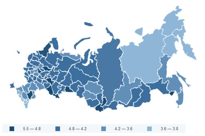 Наименьшее позитивное значение, как и ранее, был зафиксировано в Республике Ингушетия – индекс составил 3,0, республика осталась на последнем, 85 месте. 84 строчка рейтинга — Республиках Дагестан с индексом 3,0, 83 место — Саха — 3,2, 82 — Чеченская республика — 3,2, и 81 — Кабардино-Балкарии — 3,3.