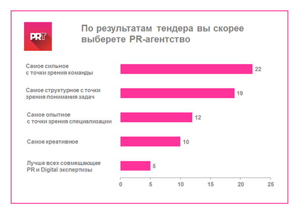 Большинство участников опроса отметили, что при анализе результатов тендера основное внимание уделяют профессионализму команды агентства (22 респондента), затем смотрят на то, как участники «питча» поняли поставленные задачи и структурность предложения (19). На третье место опрошенные клиенты поставили репутацию агентства на рынке и опыт работы в конкретной индустрии (12). На четвертое – креативную составляющую предложения (10). На пятое и последние – «мультифункциональность» – умение совмещать разные экспертизы (7).