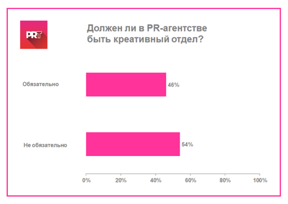 Несмотря на то, что креативная составляющая предложений не является для принимающих решение о победителе тендера приоритетом, 47% респондентов отметили, что в каждом PR агентстве должен быть отдельно выделенный креативный отдел. Остальные 53% не считают эту опцию обязательной, но скорее предпочли бы наличие такового, чем отсутствие.