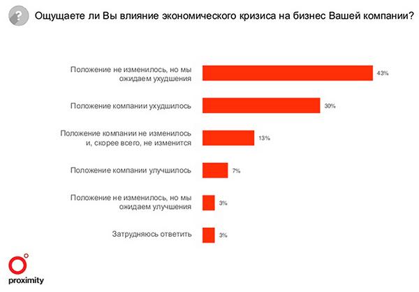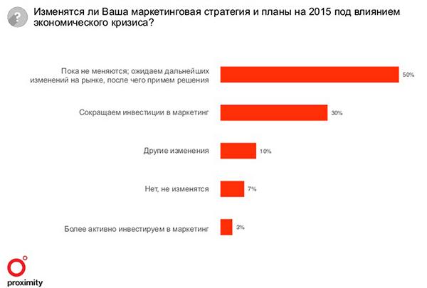 Что касается самой кризисной ситуации, то ее ощущает большинство (73%) компаний, чье положение ухудшилось или может ухудшиться в будущем. Почти половина опрошенных ожидают изменений на рынке, чтобы скорректировать свою маркетинговую стратегию. Около трети компаний заявляют о сокращении инвестиций в маркетинг. Большинство (87%) аудитории включают в свои маркетинговые задачи «стимулирование продаж».