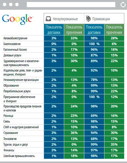 Показатели доставки во «Входящие» и вкладка «Промоакции» в интерфейсе Gmail (статистика по отраслям)