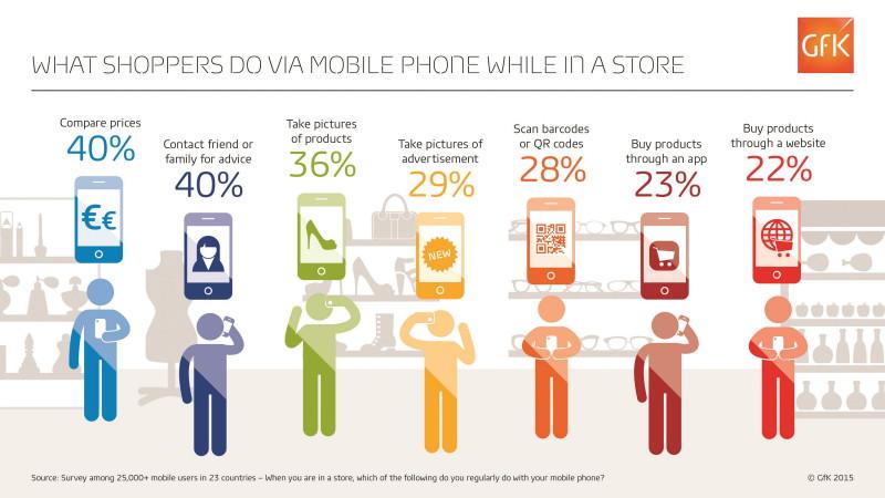 Исследовательская компания GfK провела опрос среди пользователей мобильных устройств в России и еще 22 странах мира, чтобы выяснить, как они используют телефон, находясь в магазине. 40% потребителей сравнивают цены в магазинах с ценами в интернете и звонят своим друзьям или родным, чтобы попросить совета при покупке. При этом каждый третий (36%) любит фотографировать приглянувшиеся товары
