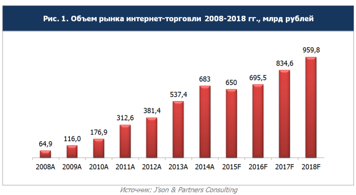 По оценкам экспертов J’son & Partners Consulting, рынок интернет-торговли России по итогам 2013 года составил 683 млрд рублей. Средний рост рынка (CAGR) в 2009-2014 годах был равен 42,5%. В 2014-2018 годах CAGR ожидается на уровне 7% в год.