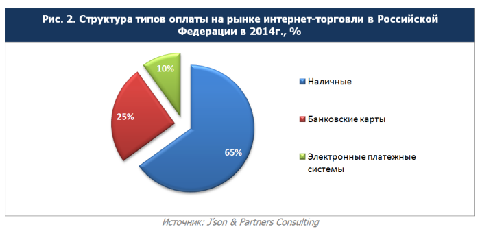 Основным средством оплаты заказов в интернет-торговле остаются наличные. В первой половине 2014 года по сравнению с аналогичным периодом прошлого года произошел резкий поворот в потребительских предпочтениях, который увеличил долю электронных платежей в два раза. Наблюдается дальнейшая тенденция снижения доли наличных в общей структуре способов оплаты на рынке интернет-торговли Российской Федерации.