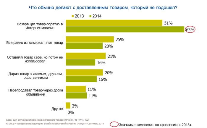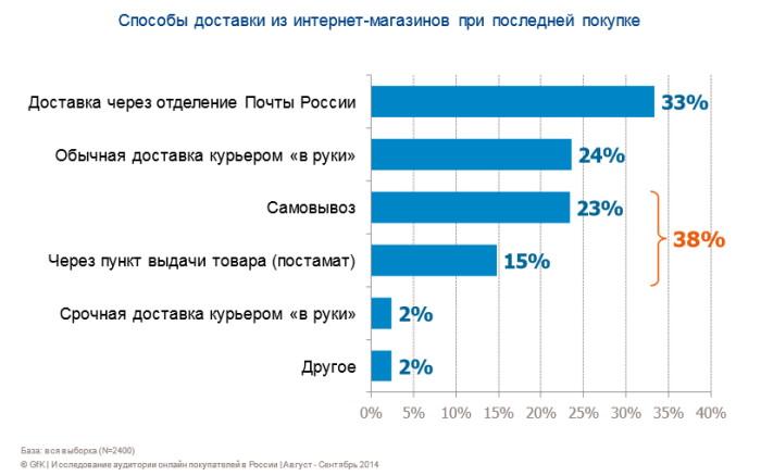 Стало больше покупателей, которые сами забирают свои заказы. Вероятно, увеличилось количество пунктов самовывоза и постаматов (автоматических пунктов выдачи). В 2014 году в пунктах самовывоза получали товар 59% опрошенных (51% в 2013 году), а в постаматах — 38% (34% годом ранее).