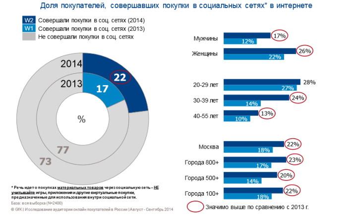 Растет роль социальных сетей в интернет-торговле. По данным на осень 2014, среди всех россиян, которые делали покупки в интернете, 22% хотя бы раз за последний год заказывали материальные (а не виртуальные, как игры или приложения) товары в соцсетях (в 2013 году — 17%).