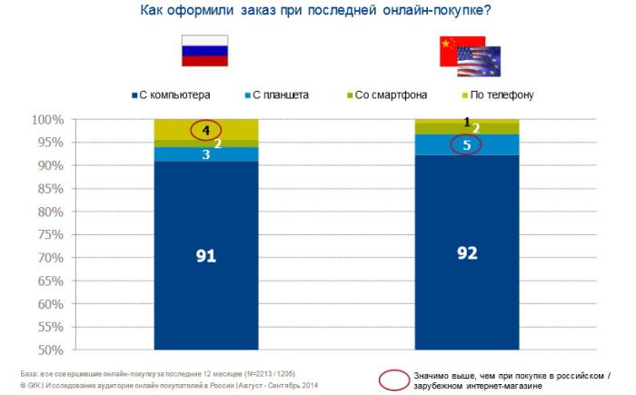 Основным устройством для покупок в интернете по-прежнему остаётся компьютер, а не мобильник или планшет. По словам респондентов, в 90% случаев при выборе и заказе товаров они использовали настольный компьютер или ноутбук.
