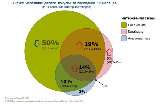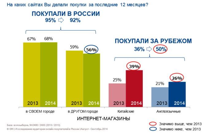 Особенно сильно выросла популярность китайских интернет-магазинов, которыми пользовались 39% опрошенных (в 2013 году — 25%). Для сравнения, в англоязычных магазинах других стран товар покупали 26% респондентов (21% в 2013). Чем меньше город, тем больше доля жителей, которые делают заказы в Китае, и меньше доля тех, кто покупает товары в других странах. В Москве это примерно одинаковые аудитории онлайн-покупателей.