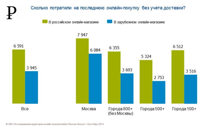 По данным на осень 2014 года, в целом по России средняя стоимость заказа в российском интернет-магазине составляет 6591 рубль, а в зарубежном — 3945. У москвичей средний чек заметно выше, зато разница между средней суммой заказа в российском и в зарубежном магазине меньше — 7947 рублей и 6084 рублей соответственно.
