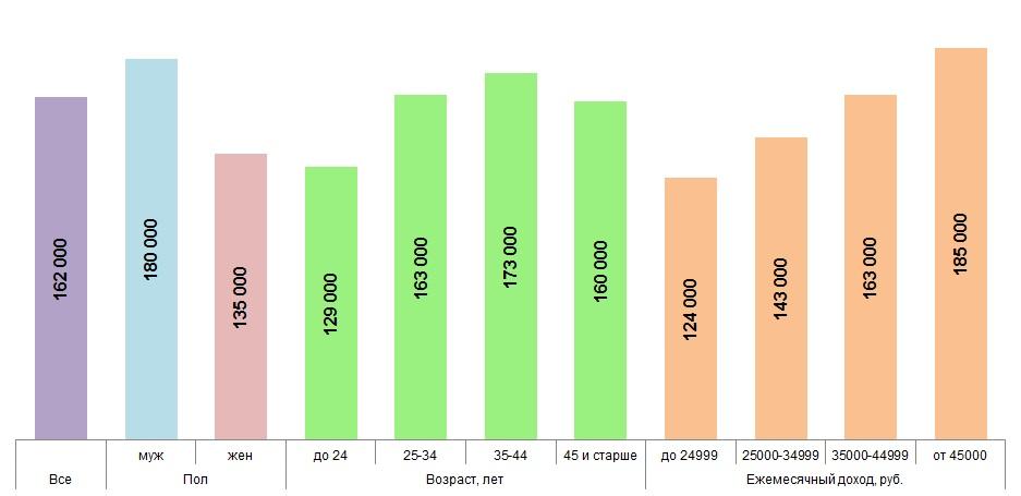 Запросы женщин, что удивительно, гораздо скромнее мужских: 135 и 180 тыс. рублей соответственно. Закономерно, что запросы тем больше, чем выше ежемесячный доход опрошенных: так, для россиян с ежемесячным доходом более 45 тыс. рублей «счастливой» является отметка в 185 тыс. рублей, в то время как россияне с зарплатой менее 25 тыс. рублей готовы довольствоваться суммой в 124 тыс. рублей.