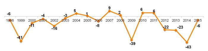Динамика Индекс экономической надежды в России в 1998-2015 годах (в процентных пунктах).