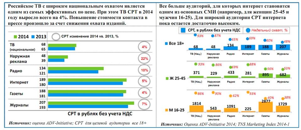 Активно растет аудитория, для которой интернет становится одним из основных СМИ, например, для женщин 25-45 лет и мужчин 16-25 года. Однако СPT интернета для широкой аудитории все еще остается высоким (189 рублей), но его рост заметно уменьшился. Если в 2013 году медианфляция интернета по сравнению с 2012 годом составляла 15%, то в 2014 году уменьшилась на 10% и составляет 5%.