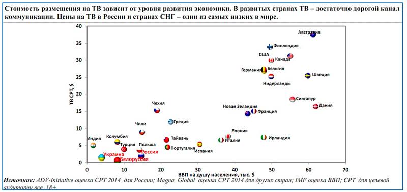 По сравнению с другими странами в России стоимость размещения рекламы на ТВ – одна из самых низких - 1,8. Самое высокое ТВ CPT – у Австралии (37.7), затем следует Финляндия (33.9), США (31.2), Бельгия (27.3), Канада (29.9), Бельгия (27.3), Германия (26.9), Швеция (25.6). Стоимость размещения на ТВ зависит от уровня развития экономики. У стран с самым высоким уровнем ВВП – самый высокий ТВ СРТ.