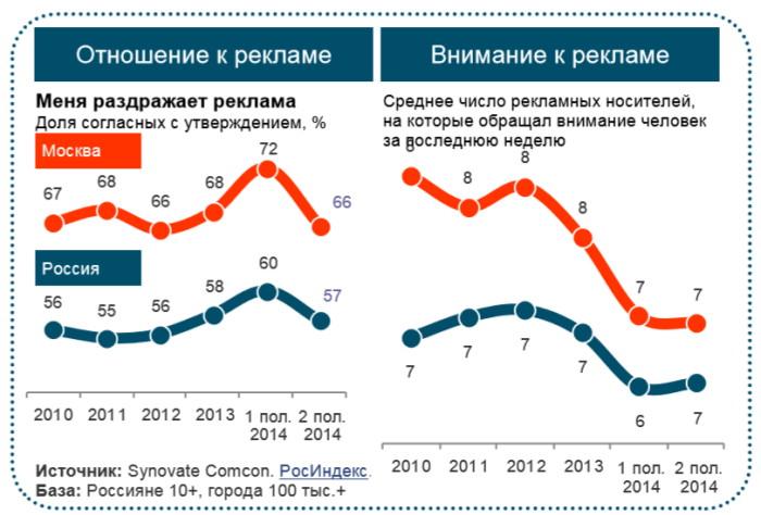Данные регулярного исследования РосИндекс компании Synovate Comcon показывают, что доля тех, кого раздражает реклама, во 2-й половине 2014 г. значительно снизилась