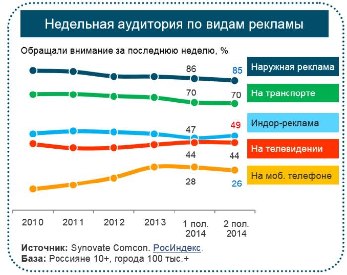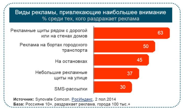 Улучшению восприятия рекламы могла способствовать усилившаяся борьба властей с незаконными рекламными конструкциями и sms-спамом, поскольку именно на эти виды группа «раздраженных рекламой» обращает внимание чаще всего. Новые правила и ограничения отразились в статистически значимом снижении внимания россиян к категориям «наружная реклама» и «реклама на мобильном телефоне» (-1 пп. и -2 пп. соответственно во 2-ом полугодии 2014 г. по сравнению с первой половиной года). При этом индор-реклама стала более заметной для россиян (+2 пп. за последние полгода). Рост в этой категории происходит за счет с повышения внимания к рекламе на магазинных полках (с 14% до 16% в 1-м и 2-м полугодиях 2014 г. соответственно) и к видеоэкранам в магазинах (с 11% до 12% в 1-м и 2-м полугодиях 2014 г. соответственно).