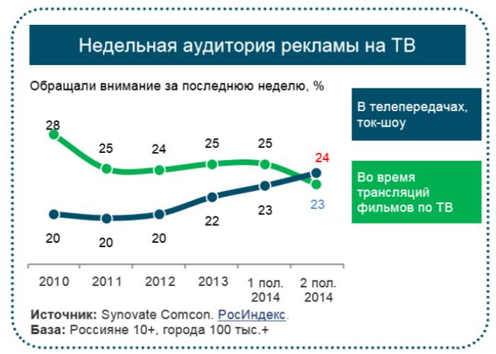 Несмотря на стабильность недельной аудитории рекламы на ТВ, внутри категории за полугодие также произошли интересные изменения. Так, аудитория рекламы во время трансляции фильмов потеряла 2 пп., одновременно подросла аудитория рекламы в телепередачах и ток-шоу, которая обогнала зрителей рекламы в фильмах.