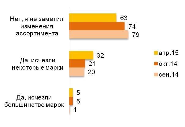 Респондентам в первую очередь был задан вопрос о том, заметили ли они изменения ассортимента на полках магазинов в связи с продуктовыми санкциями. Оказалось, что с момента последнего опроса произошли сдвиги в распределении ответов. Так, об исчезновении с полок магазинов некоторых марок товаров заявили 32% опрошенных, тогда как сразу после введения продуктового эмбарго доля таких ответов составляла 20-21%. Соответственно, сократилась доля тех, кто не заметил изменений в ассортименте брендов – с 74% в октябре прошлого года до 63% в апреле нынешнего.