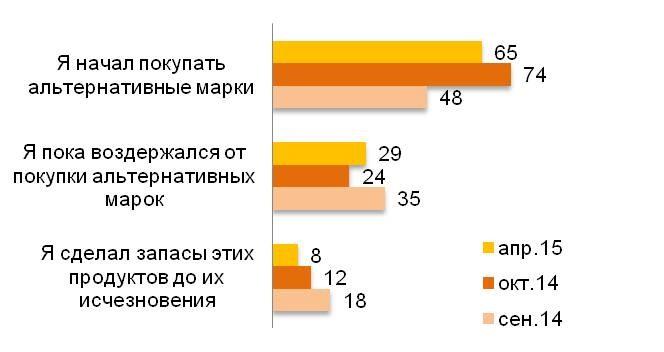 Более трети россиян (37%) заметили изменение ассортимента на полках магазинов в связи с введением продуктовых санкций, тогда как полгода назад таковых насчитывалось чуть более четверти (26%). Вдвое увеличилась доля семей, которым пришлось внести коррективы в набор продуктовой корзины в связи с санкциями – с 10% в октябре прошлого года до 20% в апреле текущего. За полгода с момента последнего опроса в полтора раза выросла доля семей, перешедших на альтернативные марки взамен исчезнувших – с 8% до 12%