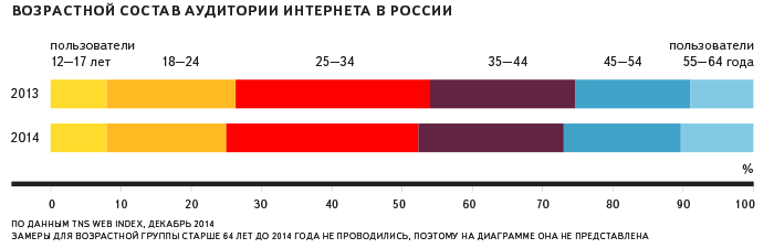 Темпы роста аудитории интернета в 2014 году сохранились на уровне предыдущего года: число пользователей увеличилось на 9%. Сильнее всего аудитория интернета выросла в сёлах, а из регионов — на Дальнем Востоке, в Санкт-Петербурге и Приволжье.