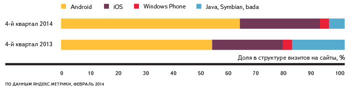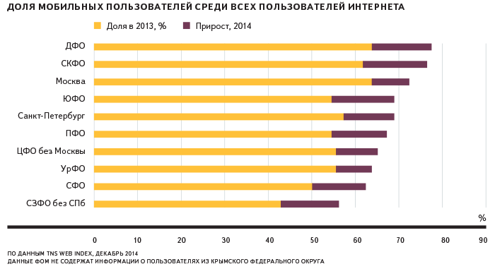 Во всех регионах больше людей стало выходить в сеть со смартфонов и планшетов. В конце 2014 года интернетом с мобильного устройства хотя бы раз в месяц пользовался каждый второй городской житель (по данным TNS Web Index для городов с населением свыше 100 тысяч человек). Самая заметная доля мобильных пользователей интернета — на Северном Кавказе и Дальнем Востоке. Там она достигает 60%.